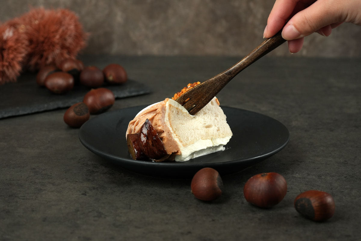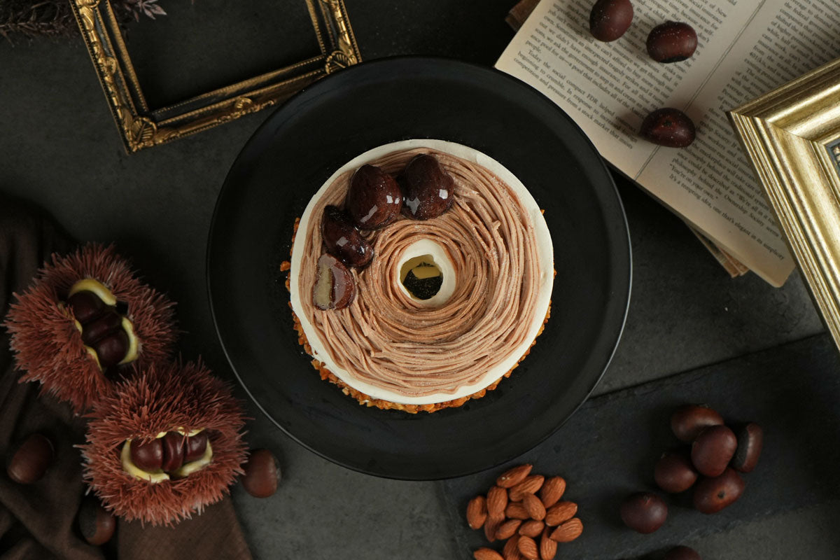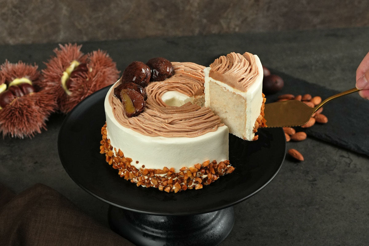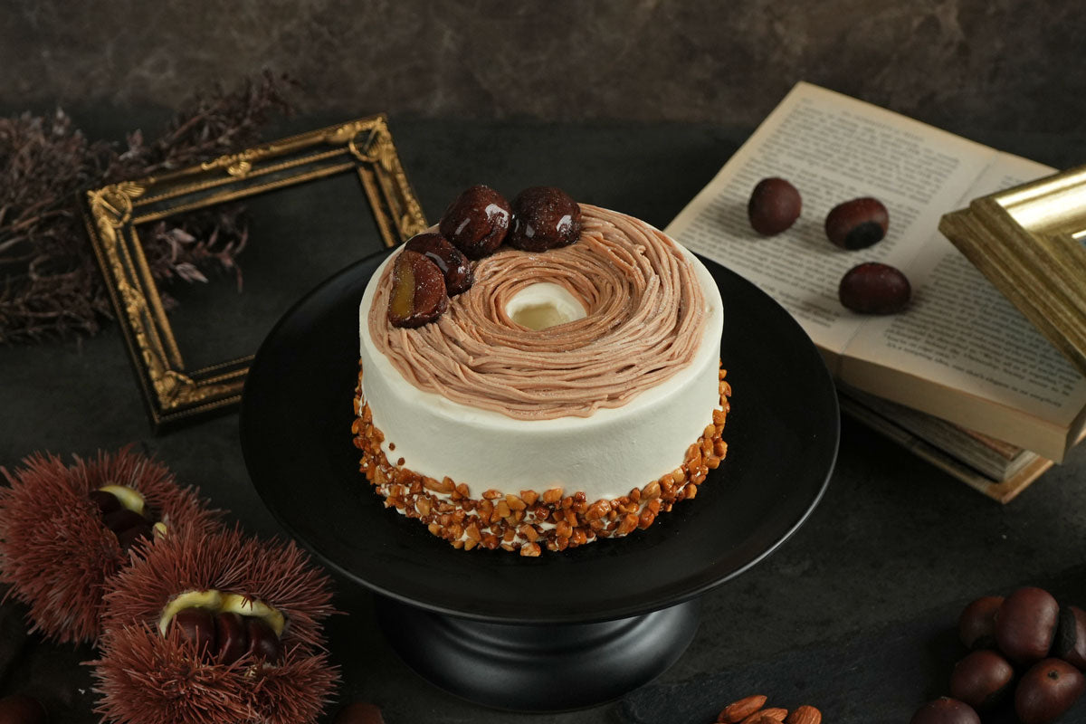 栗の香りが豊かなふわふわのシフォン生地をミルキーなクリームで丁寧にデコレーションしました。天面は濃厚なマロンクリームとアーモンドマロンクリームの2層仕立てで、一口ごとに味わいの変化を楽しめます。